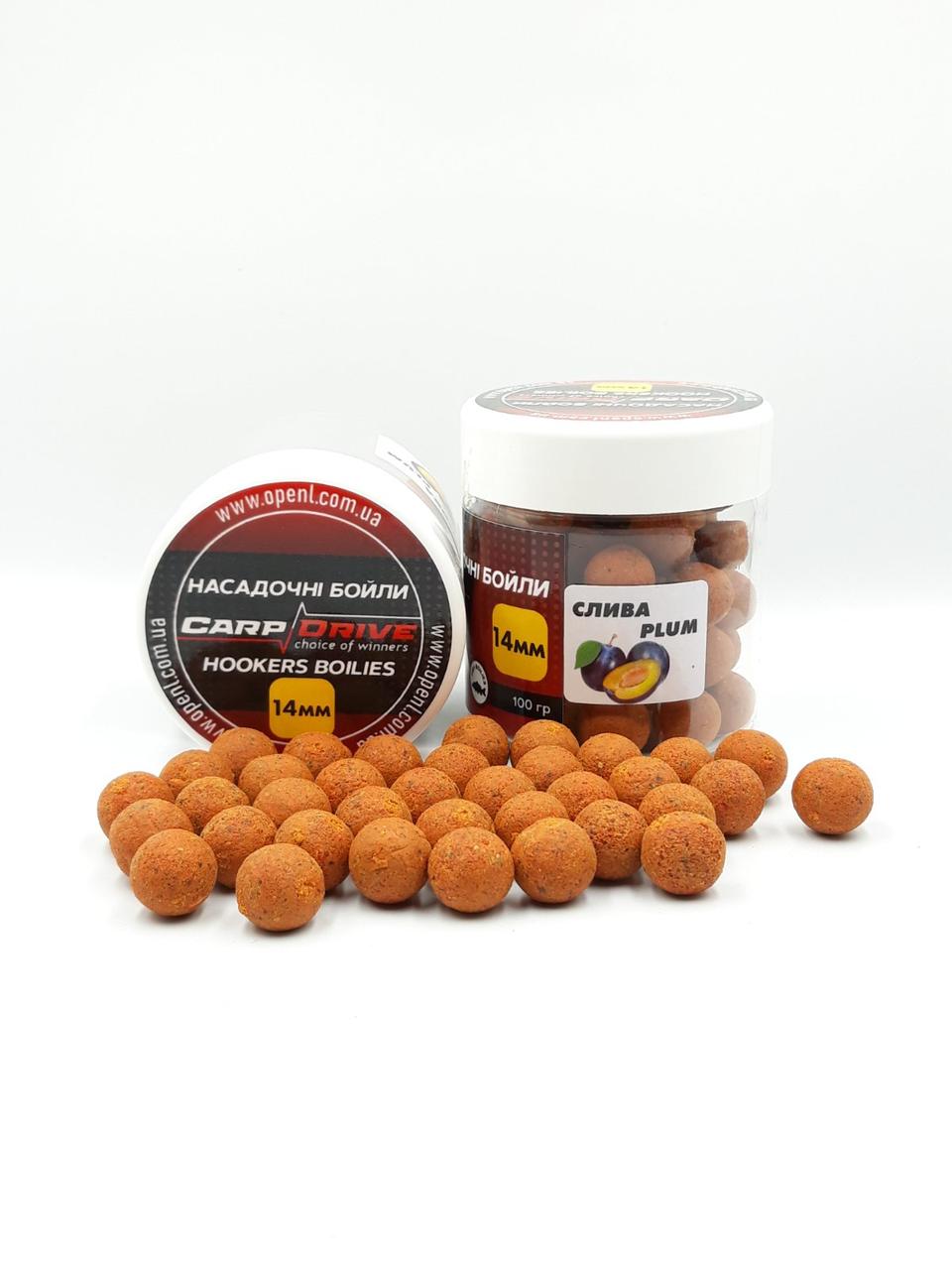 Бойли варені насадочні Carp Drive 14 мм слива 100 г фруктовий аромат сливи стабільна робота у теплій воді добрий селектор риби поєднуються з солодкими дипами та підгодовуванням