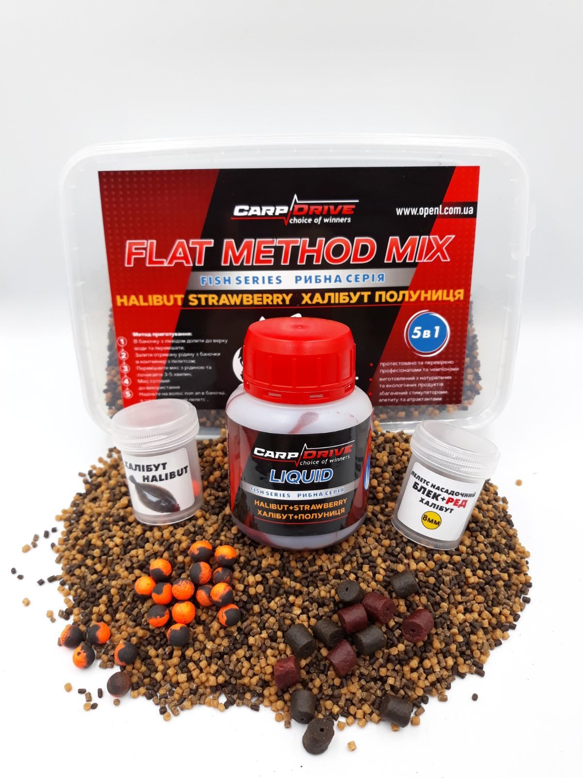 Флет метод Carp Drive мікс Halibut Strawberry 5 в 1 рибна серія халібут полуниця пелетс 2 мм — мікс halibut strawberry 5 в 1, 2 мм для результативної коропової риболовлі. Ключові запити: Carp Drive.
