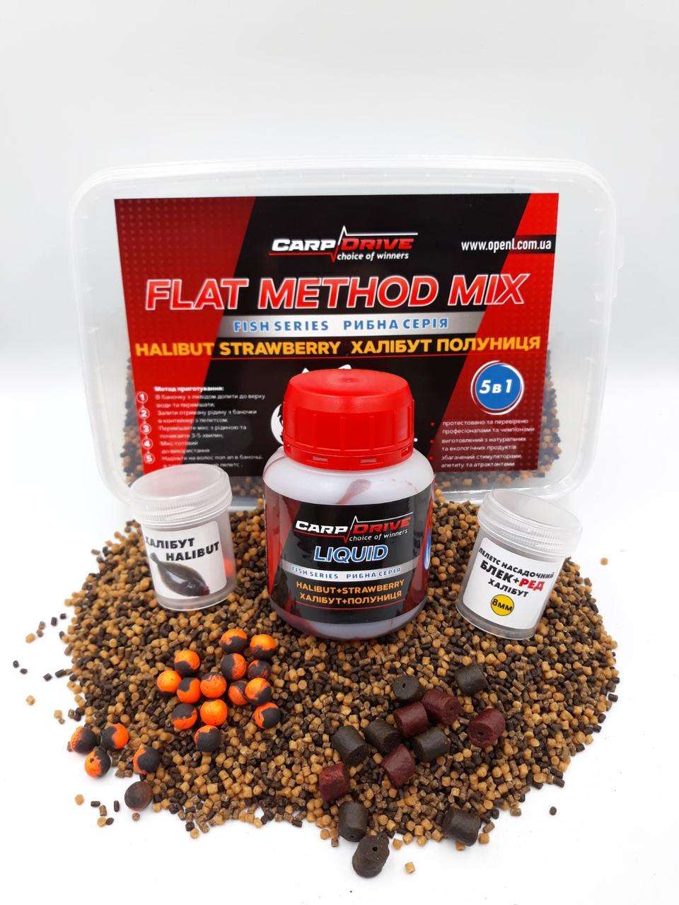 Флет метод мікс Carp Drive Halibut Strawberry халібут полуниця 5 в 1 з пелетсом 2 мм для контрастної ароми швидкої привабливості та тривалого утримання риби
