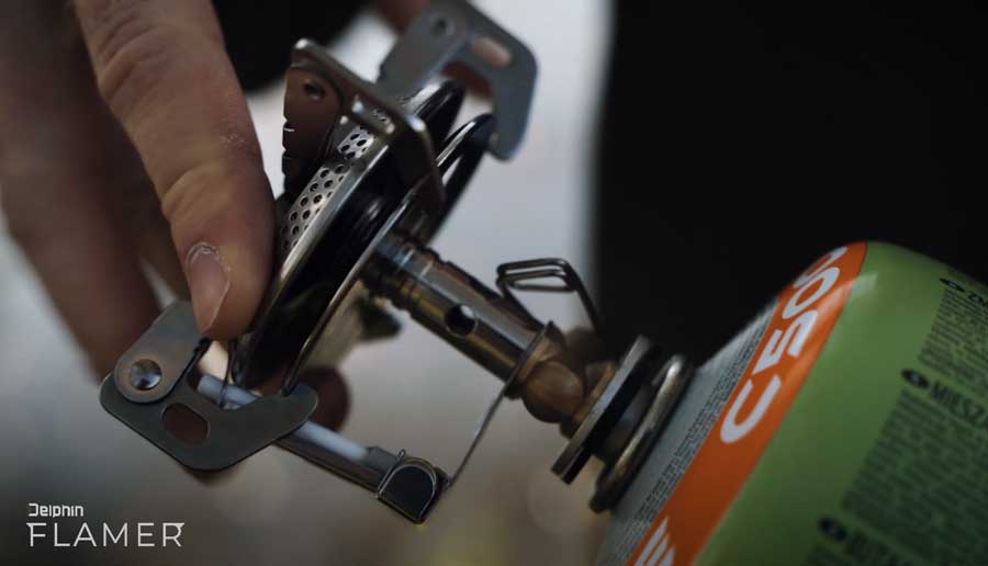 Газова плита Delphin Flamer 3000 Вт швидко кипятить воду має пєзо запалювання складну конструкцію і вагу 180 г зручно для походів