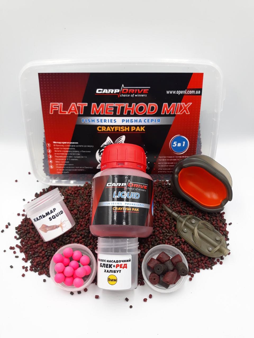 Набір Carp Drive 7в1 Crayfish для флет метод ловлі містить методний пелетс 2 мм флет метод мікс ліквід атрактант та поп ап 8 мм для швидкого залучення коропа