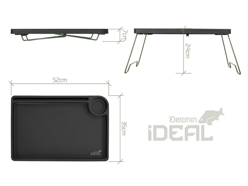 Монтажний столик для риболовлі Delphin iDEAL 52×35 см — компактний та практичний аксесуар для карпової риболовлі, який забезпечує зручну організацію снастей і монтаж оснастки. Оснащений піднятим бортиком для захисту дрібних елементів від падіння, відділенням для аксесуарів та тримачем для напою.