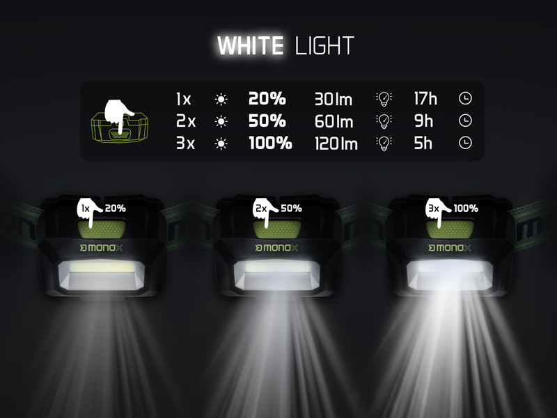 Налобний ліхтар Delphin MONOX оснащений трьома режимами білого світла, що дозволяє адаптувати освітлення під будь-які умови: