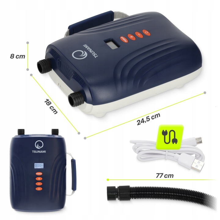 Електричний насос TSUNAMI створений для активного відпочинку. Компактні розміри та ергономічна ручка роблять його ідеальним вибором для поїздок на море, озеро або річку. Ви легко можете взяти його з собою в автомобіль, рюкзак або багаж.