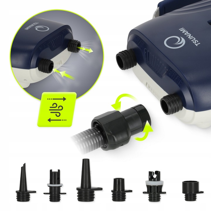 Завдяки комплекту змінних насадок цей акумуляторний насос для SUP підходить для:
