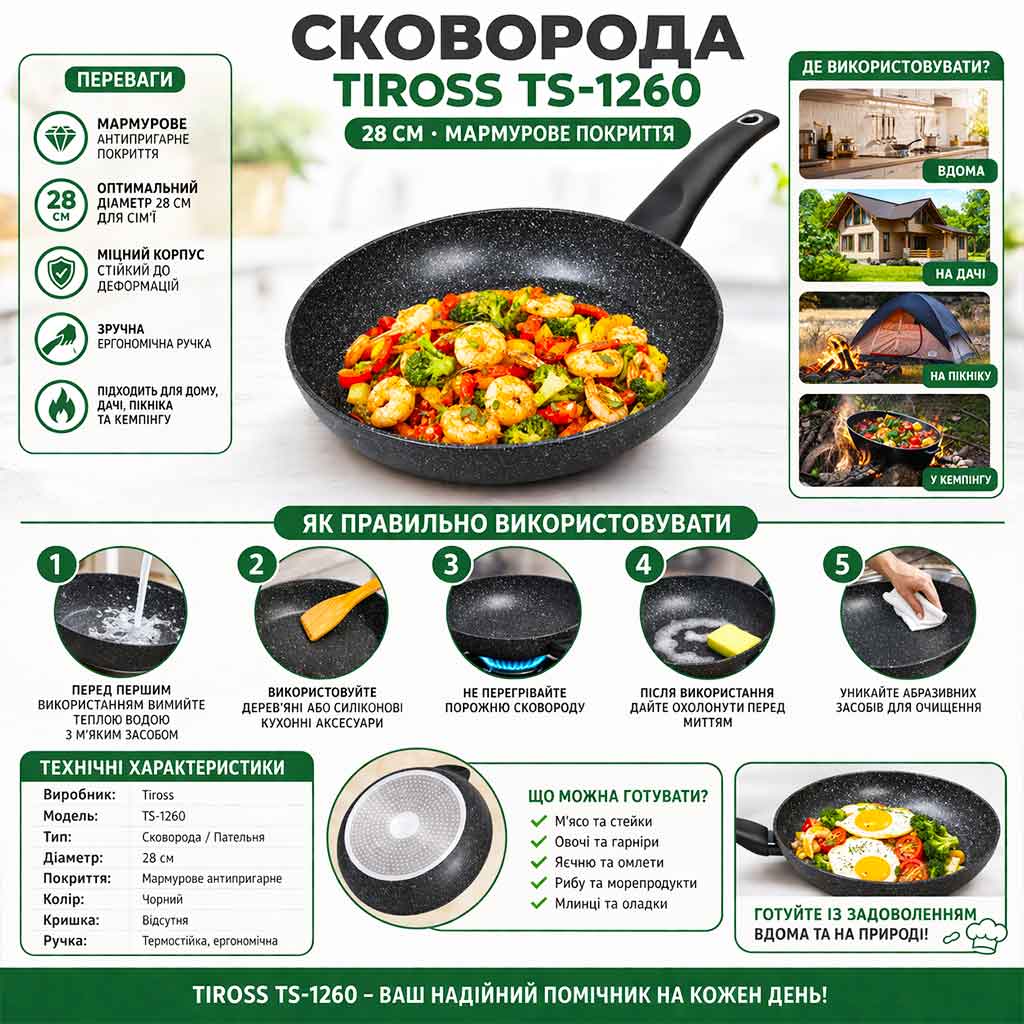 Якщо ви шукаєте сковороду для пікніка або кемпінгу, модель Tiross TS-1260 стане відмінним вибором. Вона швидко нагрівається, добре утримує тепло та дозволяє готувати м’ясо, овочі, яйця чи інші страви навіть у польових умовах.